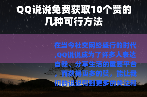 在QQ说说的世界里,只要我们用心经营,通过以上这些方法,就能够免费获得10个赞,让我们的说说在众多动态中脱颖而出,展现出自己的独特魅力,收获更多的关注和喜爱,我们要不断尝试和探索,找到最适合自己的方式,让自己在QQ说说的社交舞台上更加出彩。