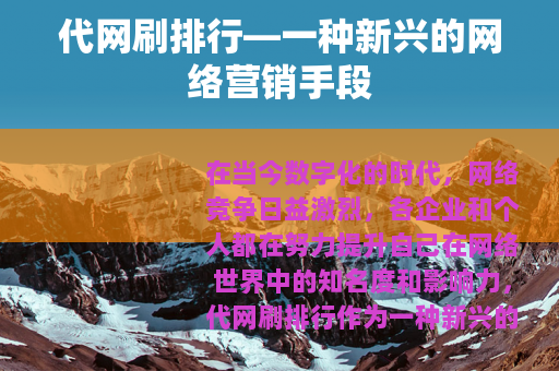 在当今数字化的时代,网络竞争日益激烈,各企业和个人都在努力提升自己在网络世界中的知名度和影响力,代网刷排行作为一种新兴的网络营销手段,逐渐受到了不少人的关注。