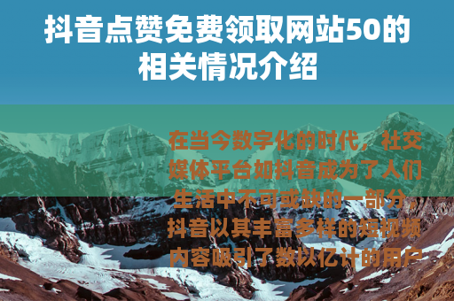在当今数字化的时代,社交媒体平台如抖音成为了人们生活中不可或缺的一部分,抖音以其丰富多样的短视频内容吸引了数以亿计的用户,而点赞则是用户表达喜爱和支持的一种重要方式,在这样的背景下,出现了一些声称可以通过特定网站免费领取抖音点赞达到50个的情况。