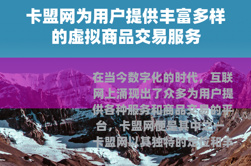 在当今数字化的时代,互联网上涌现出了众多为用户提供各种服务和商品交易的平台,卡盟网便是其中之一,卡盟网以其独特的定位和丰富的资源,在虚拟商品交易领域占据了一席之地。