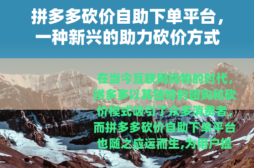 在当今互联网购物的时代,拼多多以其独特的团购和砍价模式吸引了众多消费者,而拼多多砍价自助下单平台也随之应运而生,为用户提供了一种新的砍价途径。