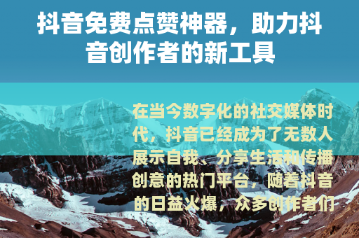 在当今数字化的社交媒体时代,抖音已经成为了无数人展示自我、分享生活和传播创意的热门平台,随着抖音的日益火爆,众多创作者们都在努力寻求各种方法来提升自己作品的曝光度和受欢迎程度,而抖音免费点赞神器的出现,无疑为他们提供了一种新的助力途径。