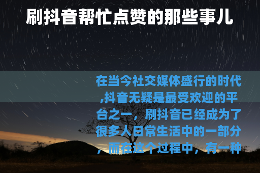 在当今社交媒体盛行的时代,抖音无疑是最受欢迎的平台之一,刷抖音已经成为了很多人日常生活中的一部分,而在这个过程中,有一种现象逐渐引起了大家的关注,那就是刷抖音帮忙点赞。