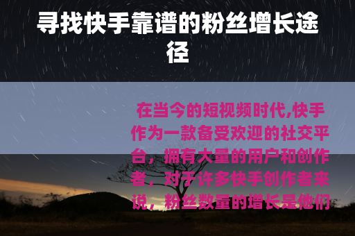在当今的短视频时代,快手作为一款备受欢迎的社交平台,拥有大量的用户和创作者,对于许多快手创作者来说,粉丝数量的增长是他们关注的重点之一,因为更多的粉丝意味着更高的知名度和更多的机会,在追求粉丝增长的道路上,我们需要选择合法合规且靠谱的方式。