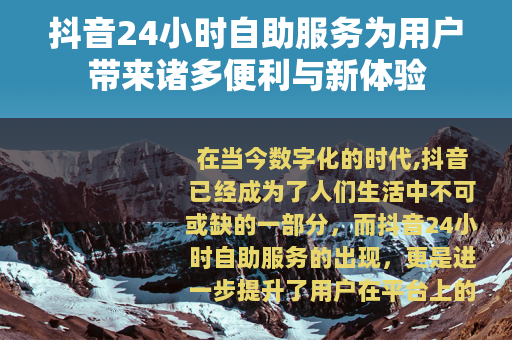 在当今数字化的时代,抖音已经成为了人们生活中不可或缺的一部分,而抖音24小时自助服务的出现,更是进一步提升了用户在平台上的体验,为用户带来了诸多的便利。