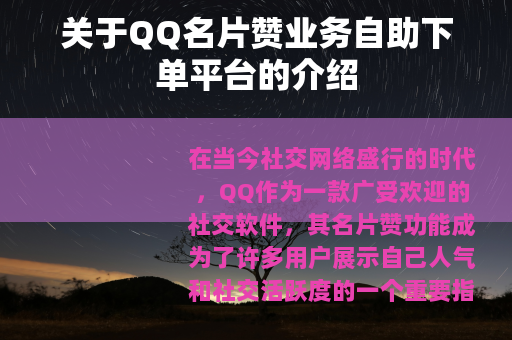 在当今社交网络盛行的时代,QQ作为一款广受欢迎的社交软件,其名片赞功能成为了许多用户展示自己人气和社交活跃度的一个重要指标,随之而来的,便是QQ名片赞业务自助下单平台的兴起,为用户提供了一种便捷获取名片赞的途径。