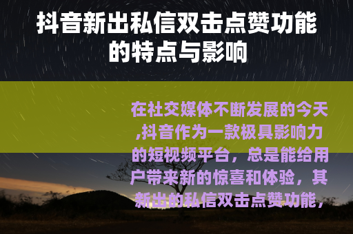 无论是个人用户在日常生活中的社交分享,还是创作者在创作道路上的探索与成长,亦或是品牌方在商业推广中的尝试与突破,抖音的私信双击点赞功能都将在其中扮演着重要的角色,它将成为连接用户与用户、用户与创作者、用户与品牌方之间的重要桥梁,促进各方之间的沟通与合作,共同构建一个充满活力、富有创意和价值的抖音社交世界,让我们共同期待这一功能在未来能够带给我们更多的惊喜和精彩,让抖音的社交之旅更加丰富多彩。