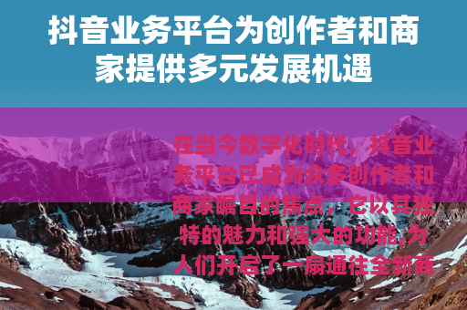 在当今数字化时代,抖音业务平台已成为众多创作者和商家瞩目的焦点,它以其独特的魅力和强大的功能,为人们开启了一扇通往全新商业和创作领域的大门。