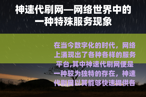 在当今数字化的时代,网络上涌现出了各种各样的服务平台,其中神速代刷网便是一种较为独特的存在。