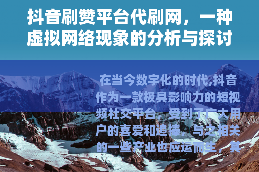 在当今数字化的时代,抖音作为一款极具影响力的短视频社交平台,受到了广大用户的喜爱和追捧,与之相关的一些产业也应运而生,其中抖音刷赞平台代刷网便是较为引人注目的一种。