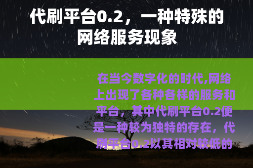 在当今数字化的时代,网络上出现了各种各样的服务和平台,其中代刷平台0.2便是一种较为独特的存在,代刷平台0.2以其相对较低的价格,吸引了不少人的关注。