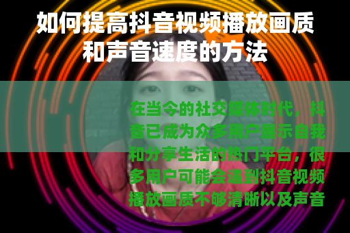 在当今的社交媒体时代,抖音已成为众多用户展示自我和分享生活的热门平台,很多用户可能会遇到抖音视频播放画质不够清晰以及声音速度不太合适的问题,如何提高抖音视频播放画质和声音速度呢?以下是一些实用的方法。