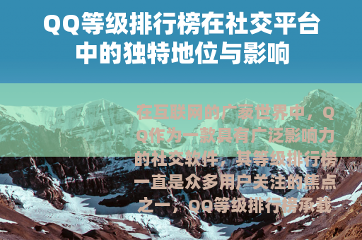 在互联网的广袤世界中,QQ作为一款具有广泛影响力的社交软件,其等级排行榜一直是众多用户关注的焦点之一,QQ等级排行榜承载着用户在虚拟社交空间中的成长与积累,有着独特的意义和价值。