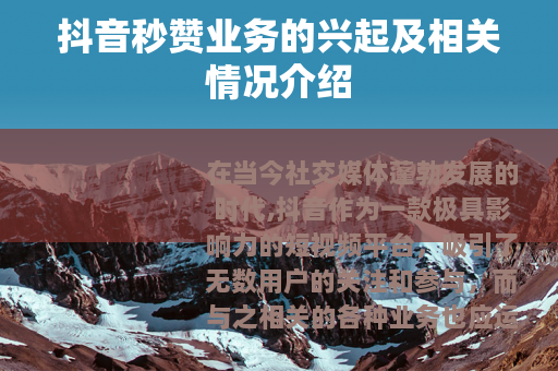 在当今社交媒体蓬勃发展的时代,抖音作为一款极具影响力的短视频平台,吸引了无数用户的关注和参与,而与之相关的各种业务也应运而生,其中抖音秒赞业务便是近年来受到不少人关注的一种。
