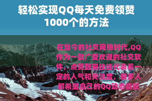 通过以上这些方法的综合运用,我们就能够在QQ上实现每天免费领赞1000个的目标,这不仅能让我们在QQ空间中获得更多的关注和认可,还能增加我们在社交网络中的影响力和人气,让我们一起行动起来,用这些有效的方法为自己的QQ空间增添光彩,收获满满的赞数吧。