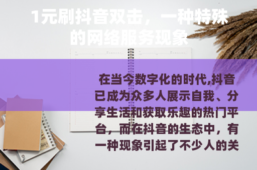 在当今数字化的时代,抖音已成为众多人展示自我、分享生活和获取乐趣的热门平台,而在抖音的生态中,有一种现象引起了不少人的关注,那就是1元刷抖音双击的服务。