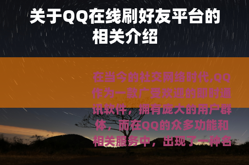 在当今的社交网络时代,QQ作为一款广受欢迎的即时通讯软件,拥有庞大的用户群体,而在QQ的众多功能和相关服务中,出现了一种名为QQ在线刷好友平台的服务。