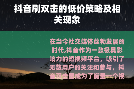 在当今社交媒体蓬勃发展的时代,抖音作为一款极具影响力的短视频平台,吸引了无数用户的关注和参与,抖音双击量成为了衡量一个视频受欢迎程度的重要指标之一,而在网络上,出现了一种声称抖音刷双击0.01元100个双击的现象,引发了不少人的兴趣和讨论。