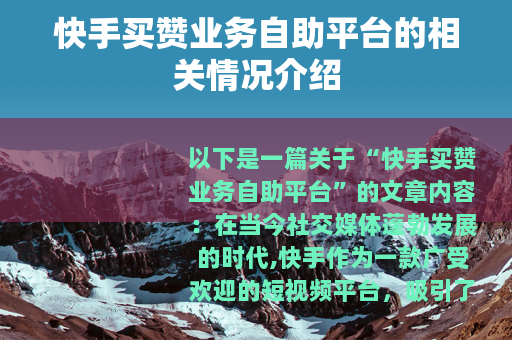 以下是一篇关于“快手买赞业务自助平台”的文章内容:
