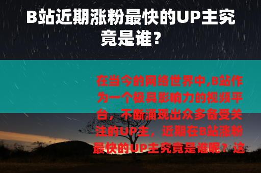 在当今的网络世界中,B站作为一个极具影响力的视频平台,不断涌现出众多备受关注的UP主,近期在B站涨粉最快的UP主究竟是谁呢?这成为了许多用户和行业人士都十分好奇的问题。