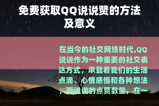 在当今的社交网络时代,QQ说说作为一种重要的社交表达方式,承载着我们的生活点滴、心情感悟和各种想法,而说说的点赞数量,在一定程度上也反映了其受欢迎程度和影响力,免费获得QQ说说赞成为了许多人关注的话题,今天我们就来聊聊关于免费获取QQ说说赞20个的那些事儿。