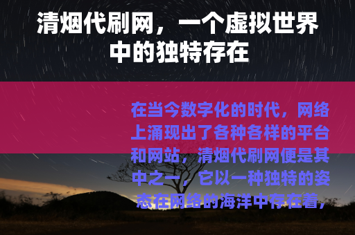 在当今数字化的时代,网络上涌现出了各种各样的平台和网站,清烟代刷网便是其中之一,它以一种独特的姿态在网络的海洋中存在着,吸引着众多用户的目光。