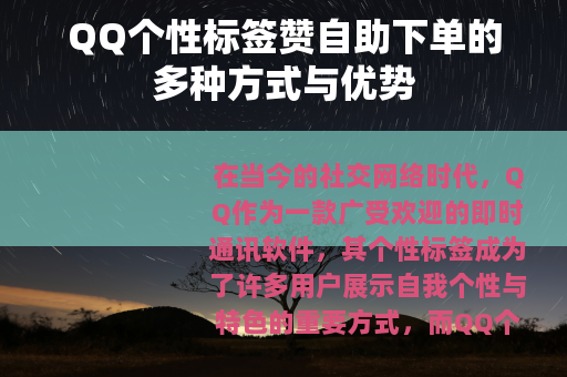 在当今的社交网络时代,QQ作为一款广受欢迎的即时通讯软件,其个性标签成为了许多用户展示自我个性与特色的重要方式,而QQ个性标签赞自助下单服务也应运而生,为广大用户提供了一种便捷的增加标签赞的途径。