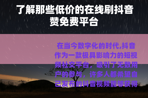 在当今数字化的时代,抖音作为一款极具影响力的短视频社交平台,吸引了无数用户的参与,许多人都希望自己发布的抖音视频能够获得更多的点赞,从而获得更多的关注和流量,在这样的需求下,一些在线刷抖音赞的免费平台应运而生,且以低价的优势吸引着众多用户。