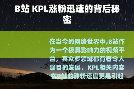 在当今的网络世界中,B站作为一个极具影响力的视频平台,其众多领域都有着令人瞩目的发展,KPL相关内容在B站的涨粉速度更是引起了广泛的关注。