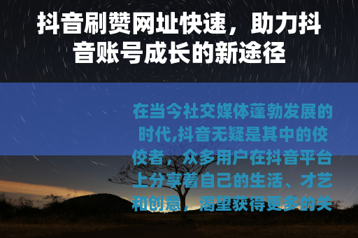 抖音刷赞网址快速为抖音用户提供了一个快速提升账号热度和影响力的有效途径,它的出现,让更多的人有机会在抖音这个广阔的舞台上展现自己的风采,实现自己的梦想,相信在未来,随着技术的不断发展和完善,抖音刷赞网址快速将会在抖音生态中发挥更加重要的作用,为更多的用户带来便利和机遇。