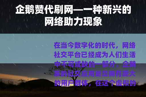 在当今数字化的时代,网络社交平台已经成为人们生活中不可或缺的一部分,企鹅系的社交应用更是拥有庞大的用户群体,在这个虚拟的社交世界里,点赞、评论等互动行为成为了人们表达喜爱和关注的重要方式,而企鹅赞代刷网也随之应运而生,它为用户提供了一种快速增加点赞数量的途径,在一定程度上满足了部分用户对于社交影响力提升的需求。