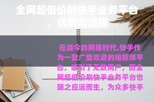 在当今的网络时代,快手作为一款广受欢迎的短视频平台,吸引了无数用户,而全网超低价刷快手业务平台也随之应运而生,为众多快手用户提供了一种提升自身账号数据的途径。