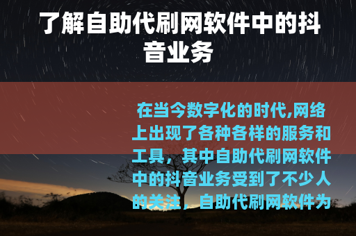 在当今数字化的时代,网络上出现了各种各样的服务和工具,其中自助代刷网软件中的抖音业务受到了不少人的关注。