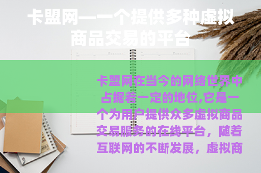 卡盟网在当今的网络世界中占据着一定的地位,它是一个为用户提供众多虚拟商品交易服务的在线平台,随着互联网的不断发展,虚拟商品的交易需求也日益增长,卡盟网应运而生,满足了许多用户在这方面的需求。