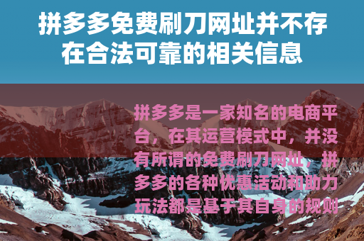 拼多多是一家知名的电商平台,在其运营模式中,并没有所谓的免费刷刀网址,拼多多的各种优惠活动和助力玩法都是基于其自身的规则和系统设定,旨在为用户提供公平、合法的购物体验和福利获取途径。