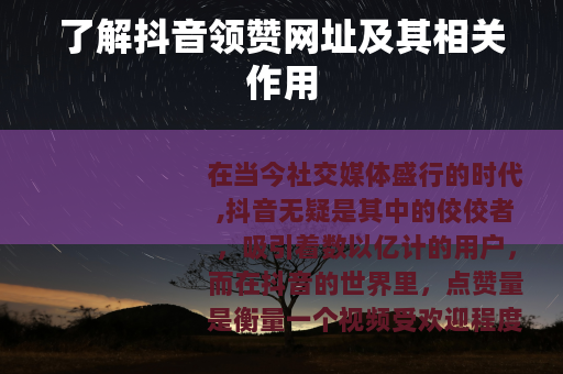 在当今社交媒体盛行的时代,抖音无疑是其中的佼佼者,吸引着数以亿计的用户,而在抖音的世界里,点赞量是衡量一个视频受欢迎程度的重要指标之一,抖音领赞网址便应运而生,成为了许多用户关注的焦点。