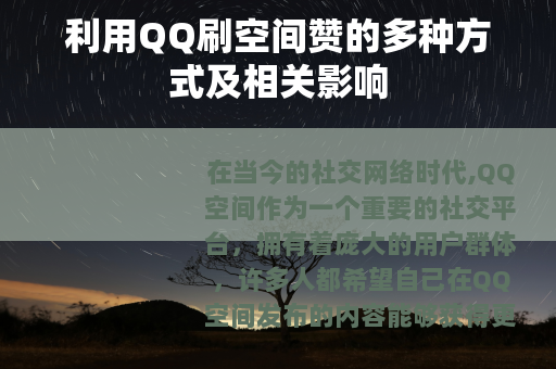 在当今的社交网络时代,QQ空间作为一个重要的社交平台,拥有着庞大的用户群体,许多人都希望自己在QQ空间发布的内容能够获得更多的关注和点赞,这不仅能满足自己的社交需求,还能在一定程度上提升自己的社交影响力,而QQ刷空间赞也因此成为了一种较为常见的现象,并且有着多种实现的方式。