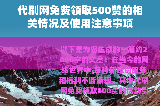 在当今的网络世界中,各种新奇的服务和福利不断涌现,其中代刷网免费领取500赞的活动引起了不少人的关注,对于许多在社交平台上活跃的用户来说,点赞数量往往代表着一定的人气和关注度,而能够免费获得500赞无疑是一个极具吸引力的机会。