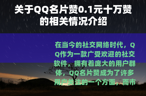 但不可否认的是,在当前的社交网络环境下,这种QQ名片赞0.1元十万赞的服务有其存在的市场需求,它反映了一部分用户对于社交认可和关注度的渴望,也体现了商家对于市场需求的敏锐捕捉和商业运作能力,对于QQ平台来说,如何在满足用户合理需求的同时,维护好社交生态的真实性和健康性,是一个需要深入思考和解决的问题,平台可以通过加强技术监测,规范用户行为,引导用户树立正确的社交价值观等方式,来应对这种现象带来的挑战,让QQ的社交环境更加和谐、真实和有活力。