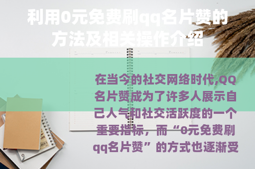 在当今的社交网络时代,QQ名片赞成为了许多人展示自己人气和社交活跃度的一个重要指标,而“0元免费刷qq名片赞”的方式也逐渐受到了不少人的关注。