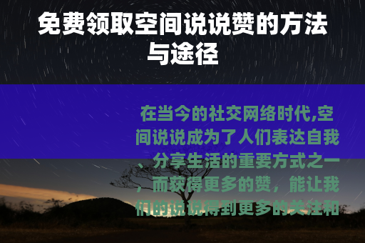 在当今的社交网络时代,空间说说成为了人们表达自我、分享生活的重要方式之一,而获得更多的赞,能让我们的说说得到更多的关注和认可,从而满足我们的社交需求和心理成就感,空间说说赞免费领取的方式,更是受到了许多人的关注和喜爱。