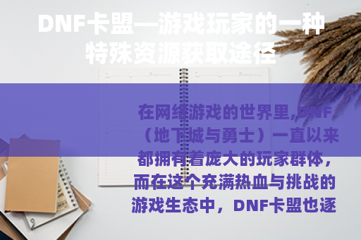 在网络游戏的世界里,DNF(地下城与勇士)一直以来都拥有着庞大的玩家群体,而在这个充满热血与挑战的游戏生态中,DNF卡盟也逐渐成为了一个备受关注的存在。