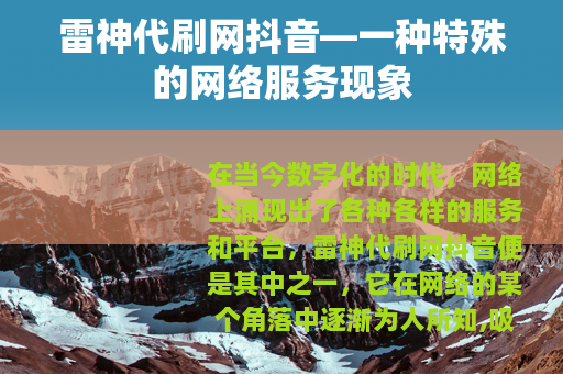 在当今数字化的时代,网络上涌现出了各种各样的服务和平台,雷神代刷网抖音便是其中之一,它在网络的某个角落中逐渐为人所知,吸引着不少人的关注。