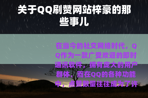 在当今的社交网络时代,QQ作为一款广受欢迎的即时通讯软件,拥有庞大的用户群体,而在QQ的各种功能中,点赞数量往往成为了许多用户关注的一个点,这就催生了像QQ刷赞网站梓豪这样的平台,它们在网络的一角悄然兴起,为用户提供了一种获取更多赞的途径。