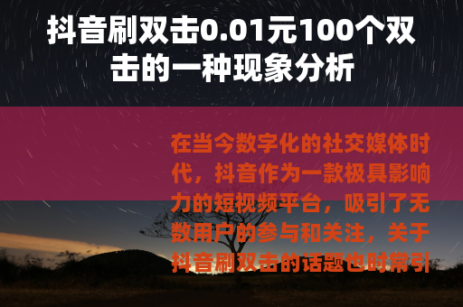 在当今数字化的社交媒体时代,抖音作为一款极具影响力的短视频平台,吸引了无数用户的参与和关注,关于抖音刷双击的话题也时常引发人们的讨论,特别是像“抖音刷双击0.01元100个双击”这样的现象更是引起了不少人的兴趣。