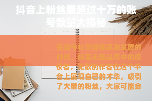 据一些行业分析和不完全统计,在抖音平台上,粉丝量超过十万的账号数量相当可观,这些账号分布在不同的领域,它们通过持续输出优质的内容,与粉丝建立了良好的互动关系,从而实现了粉丝的快速增长和积累。
