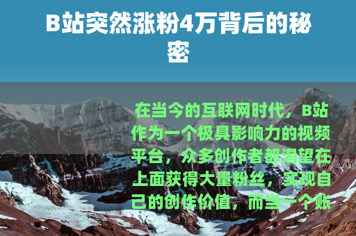 在当今的互联网时代,B站作为一个极具影响力的视频平台,众多创作者都渴望在上面获得大量粉丝,实现自己的创作价值,而当一个账号突然涨粉4万时,这无疑是一件令人兴奋且引人注目的事情。