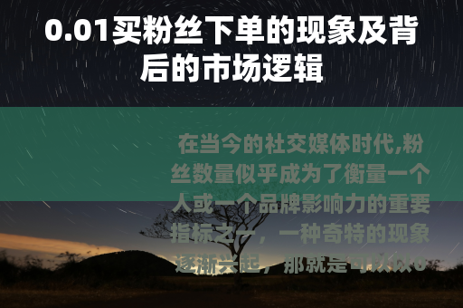 在当今的社交媒体时代,粉丝数量似乎成为了衡量一个人或一个品牌影响力的重要指标之一,一种奇特的现象逐渐兴起,那就是可以以0.01的低价买粉丝下单,这一现象引发了广泛的关注和讨论,其背后有着复杂的市场逻辑和多种因素的交织。
