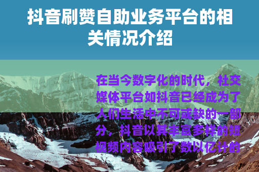 在当今数字化的时代,社交媒体平台如抖音已经成为了人们生活中不可或缺的一部分,抖音以其丰富多样的短视频内容吸引了数以亿计的用户,为创作者们提供了一个展示自我的广阔舞台,而在这个过程中,抖音刷赞自助业务平台也逐渐进入了人们的视野。