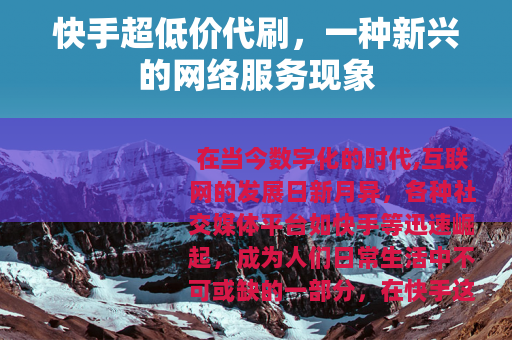 在当今数字化的时代,互联网的发展日新月异,各种社交媒体平台如快手等迅速崛起,成为人们日常生活中不可或缺的一部分,在快手这个充满活力和创意的平台上,一种名为“快手超低价代刷”的现象逐渐引起了人们的关注。